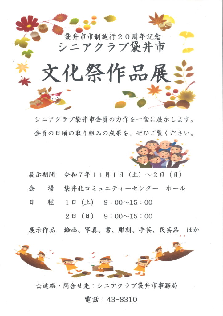 シニアクラブ袋井市会員の絵画や写真、手芸など、日頃の取り組みの成果を発表する「文化祭作品展」を、今年は「袋井市市制施行20周年記念」の冠を付して次のとおり開催いたします。