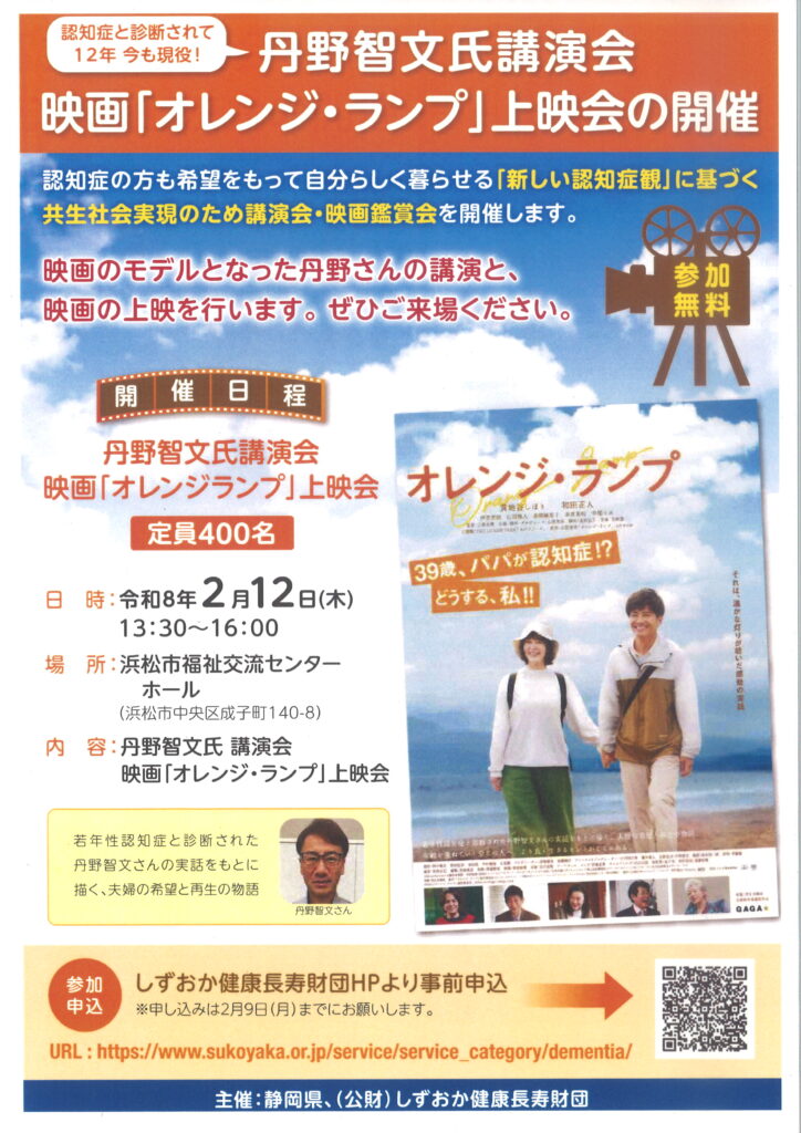 2025年12月8日 / 最終更新日時 : 2025年12月22日 シニアクラブ袋井市2 お知らせ(他団体) 丹野智文氏講演会・映画「オレンジ・ランプ」上映会開催のご案内 しずおか健康長寿財団から、丹野智文氏講演会並びに映画「オレンジ・ランプ」上映会の開催案内が届きました。参加を希望される方は下のチラシの専用フォームからお申込みください。